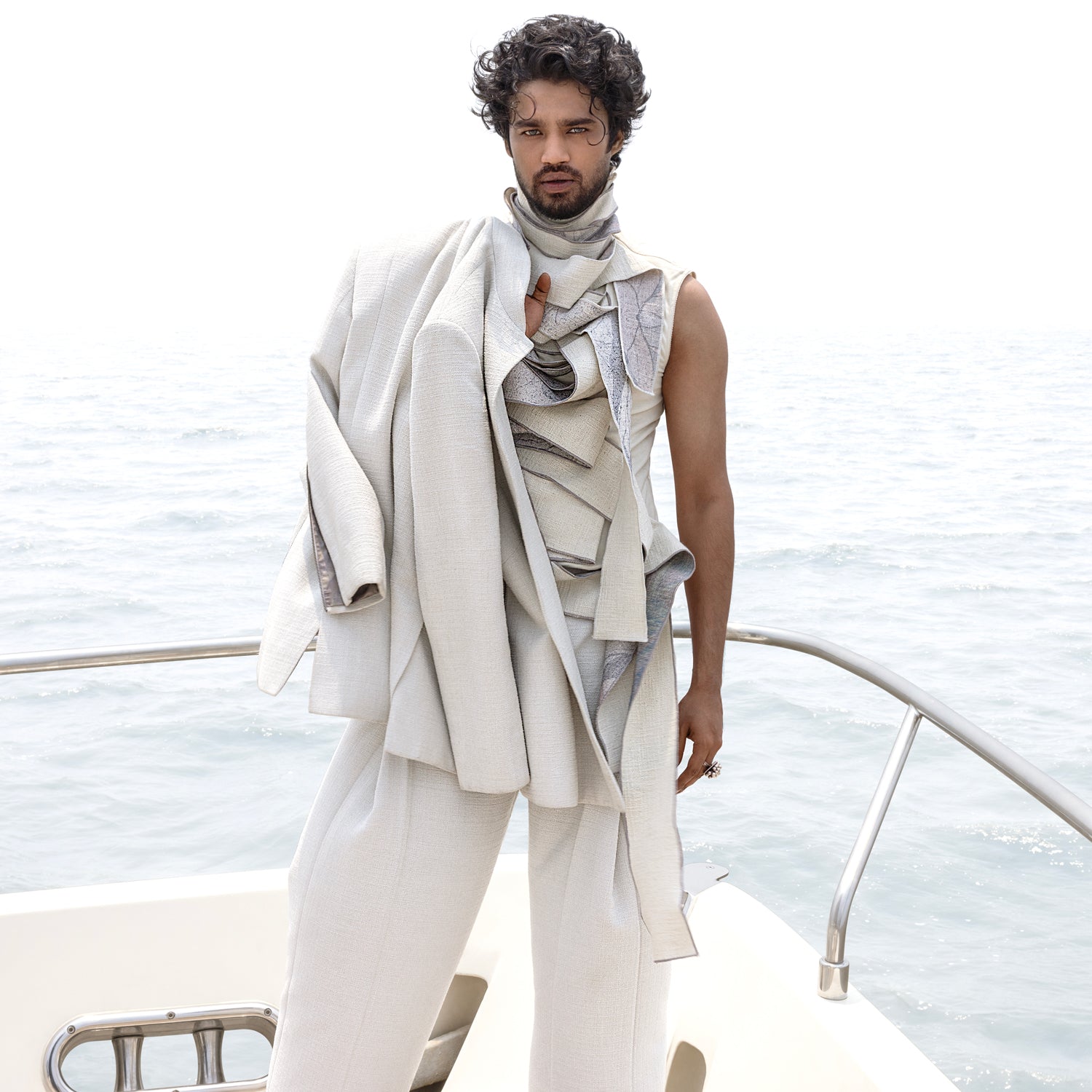 Bandgala is styled with a layered T- Shirt and paired up with the wide hem pleated trouser.