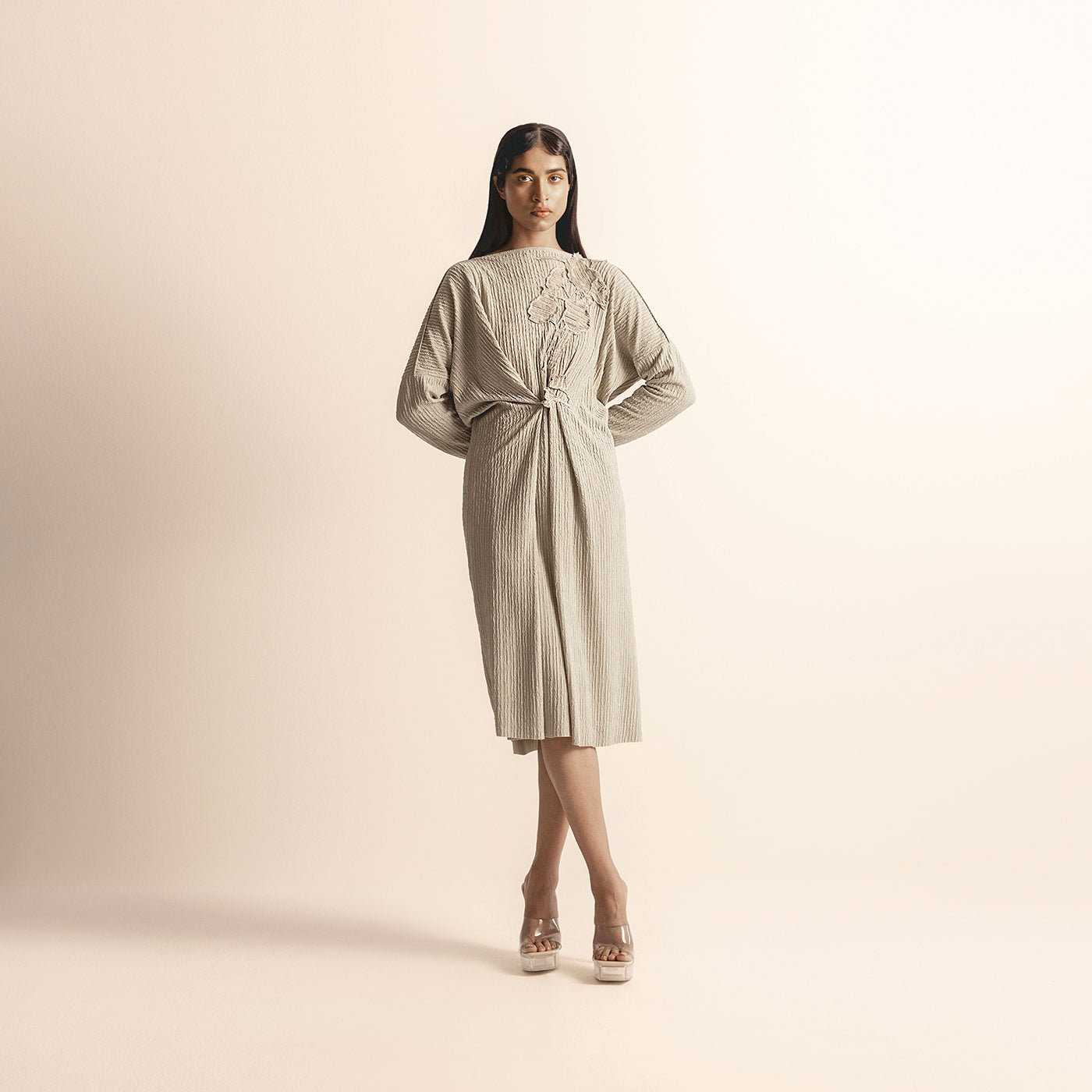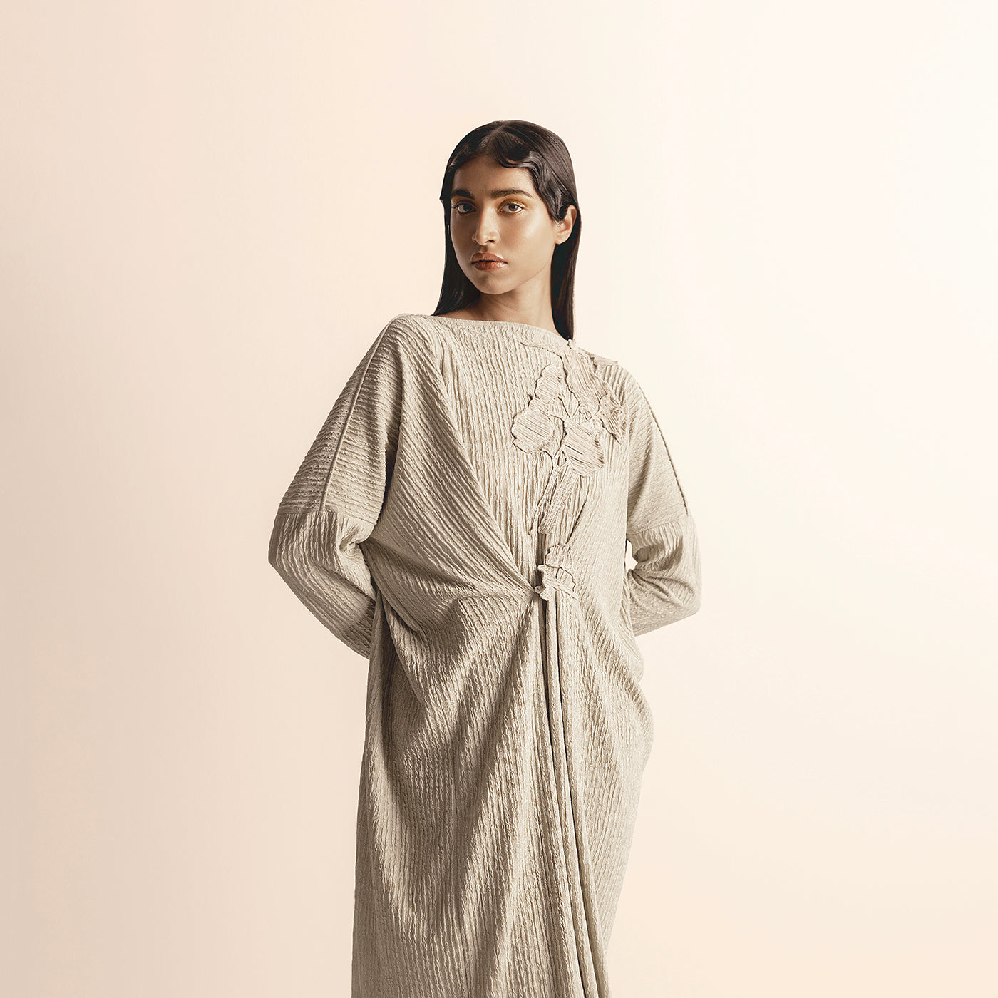Nadru knit draped tunic with dropped shoulders and yarn motifs. The yarn motifs are our in-house expertise where we inculcate the unique technique of yarn couching and weave stories henceforth. This ensemble makes for the perfect casual day-out fit.