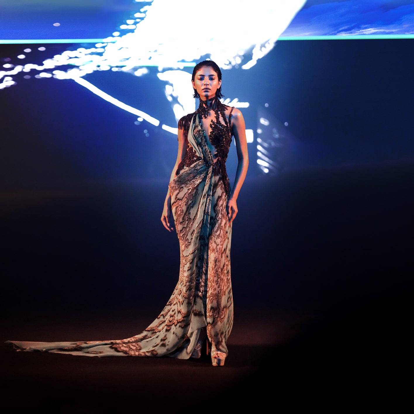 Printed textured asymmetrical draped dress with a front high slit and 3d embellished placement embroidery detailing.